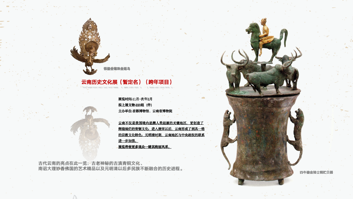 计划于2025年11月-2026年2月展出,展出文物约220组件。该展览为首都博物馆与云南省博物馆共同主办。
