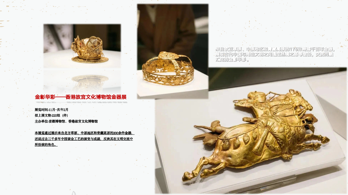 本展览通过展示来自北方草原、中原地区和青藏高原的200余件金器,述说过去三千多年中国黄金工艺的演变与成就,反映其在文明交流中所扮演的角色。