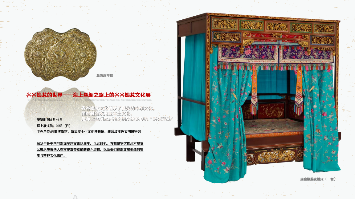 展览时间为2025年5月-8月,拟借展文物100组(件)。主办单位是首都博物馆、新加坡土生文化博物馆、新加坡亚洲文明博物馆。